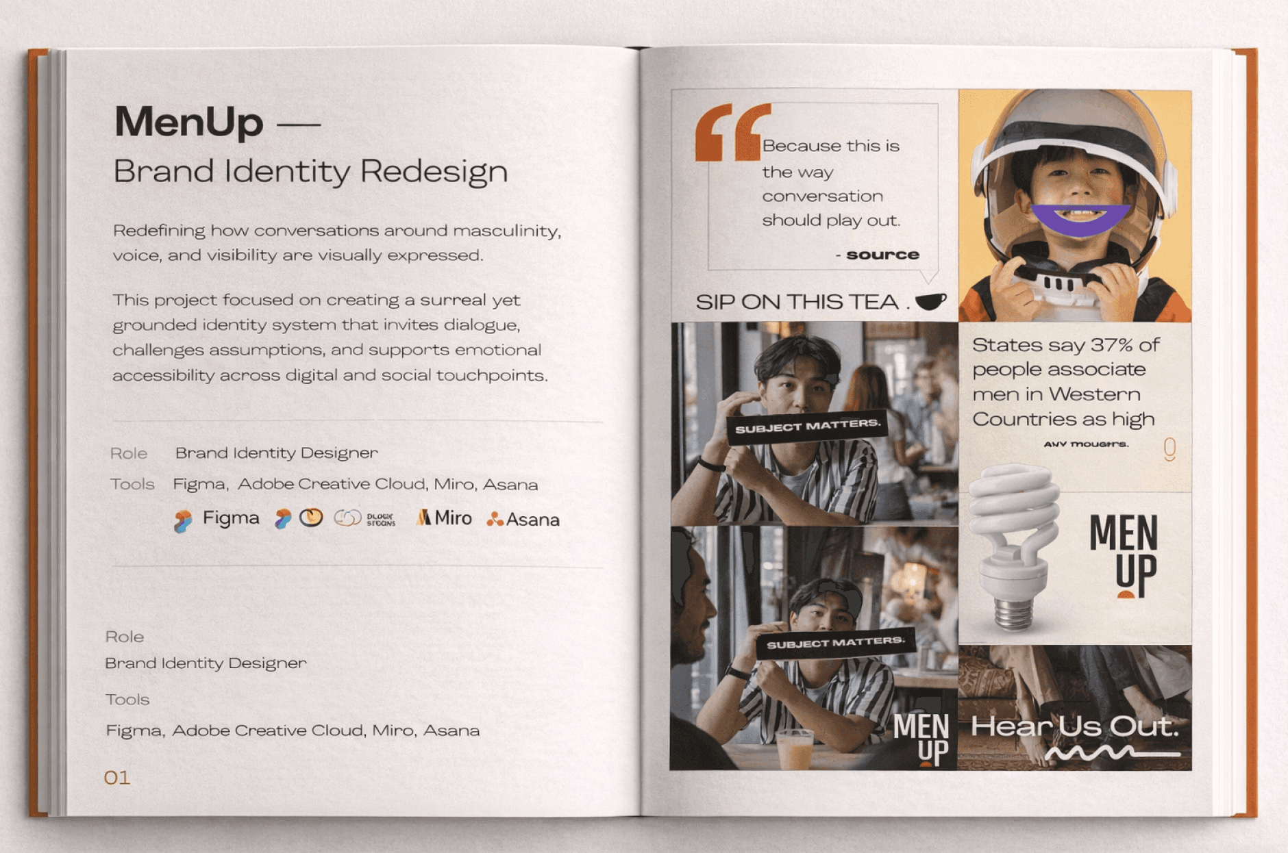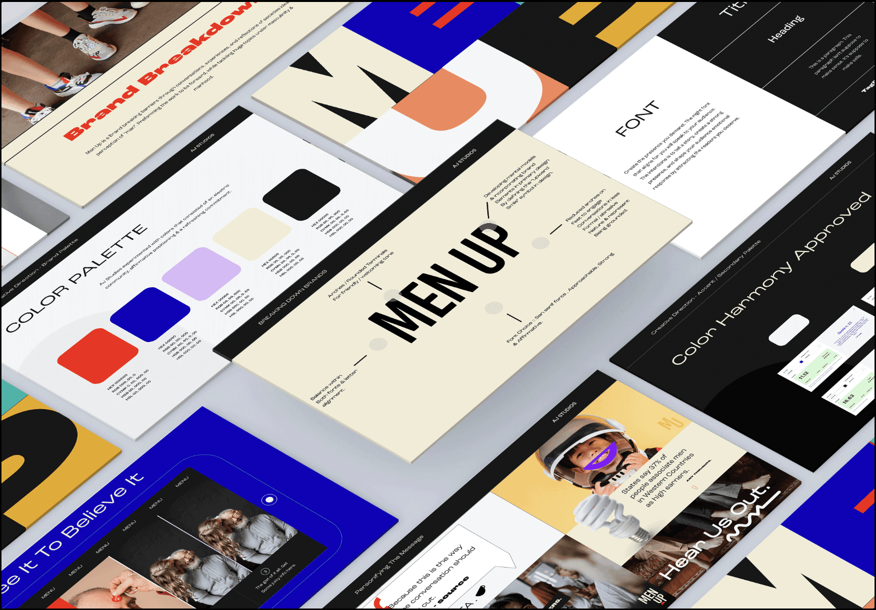 I Redefined MenUp’s visual identity to better connect with prospective clients and attract larger partnership opportunities. The goal was to rebrand for a surreal, supportive, and a-typical visual language that spoke directly to the men they serve—standing apart from traditional education and social reform aesthetics. As the sole Visual Designer, I was responsible for brand strategy research, brand positioning, marketing collateral, and a brand style guide for clarity and messaging. I worked closely with the Founder, Copy team, and Board of Directors to align strategy for clarity, messaging for engagement, and a creative visual direction.