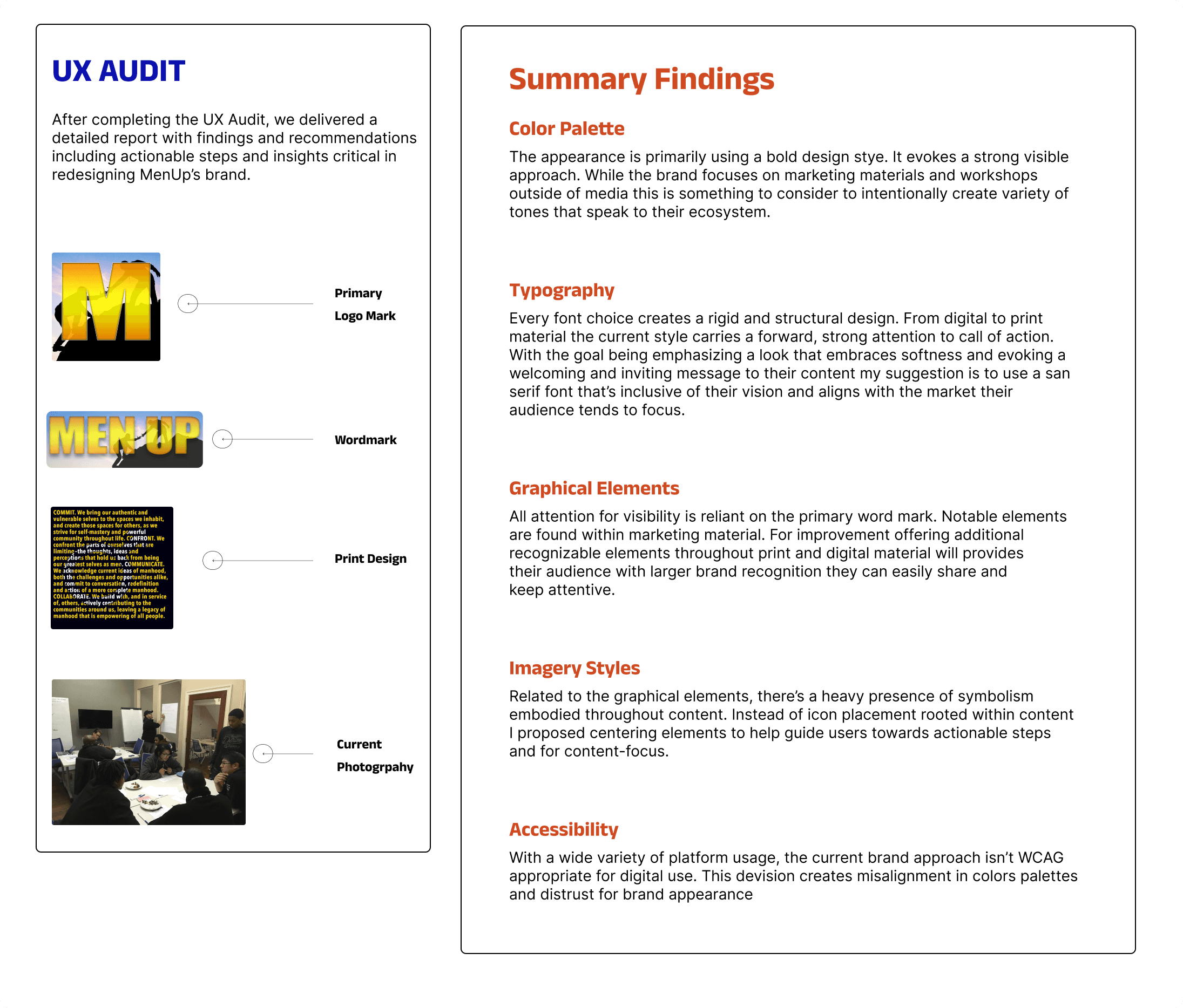 MenUp is a Educational Consulting Company focusing on education reform and social justice in underrepresented schools based in New York City. With 200 growing podcast listeners and supporting multiple schools leadership within NYC public school system they’re seeking to reimagine their visual presence for brand partnerships & new engagements across the school district.