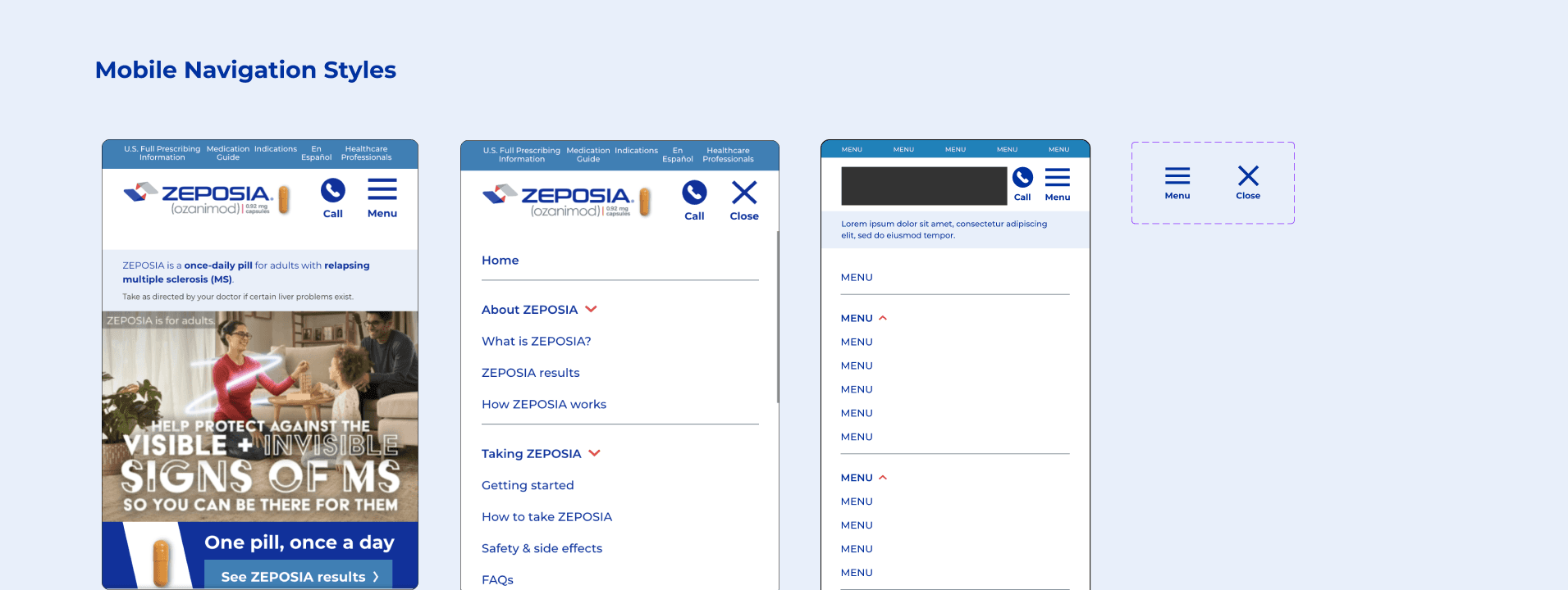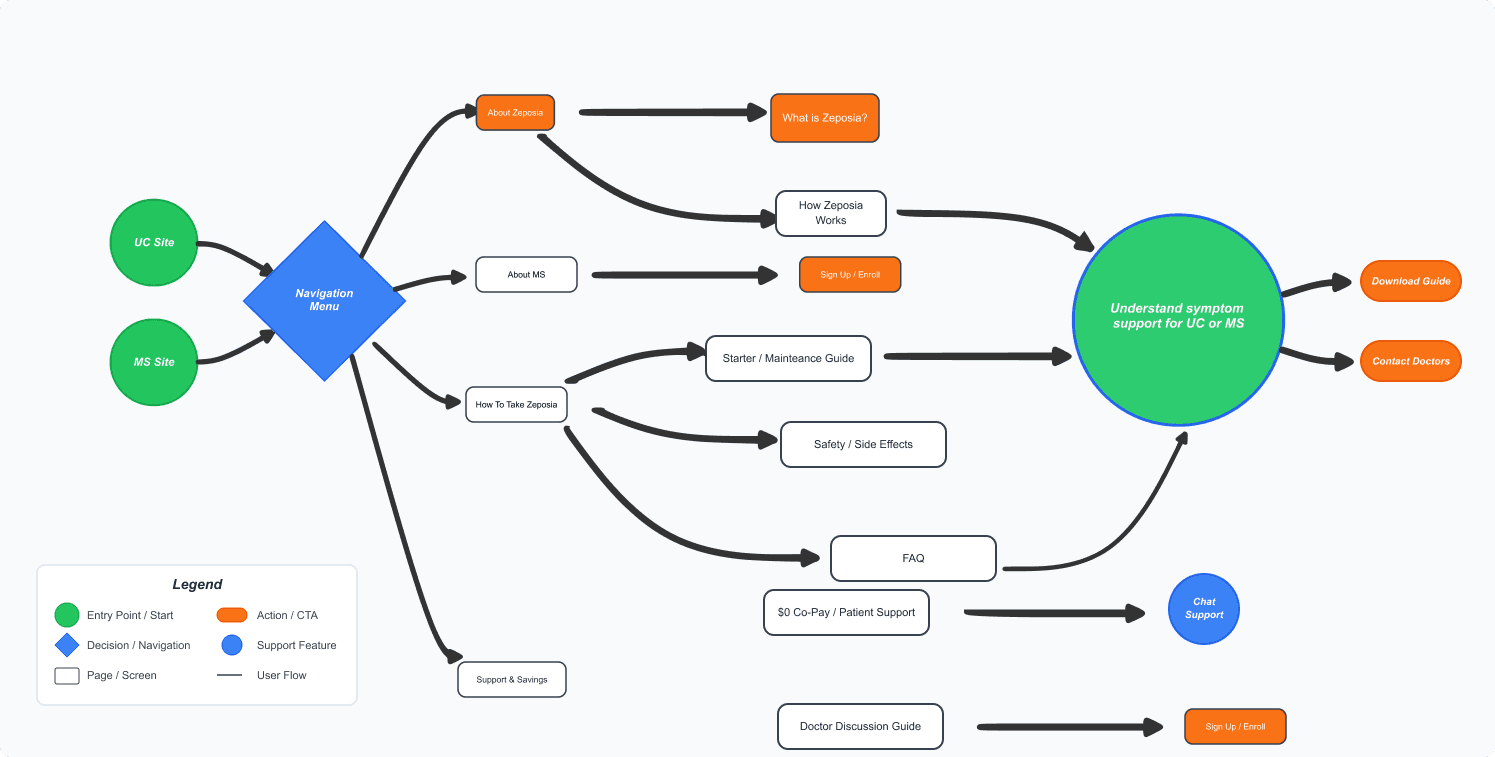 System Approach: Before designing it’s important to me to understand how to the application flows from start to finish. I mapped out key entry, decision paths, and actionable steps. This shaped a bigger picture for myself to understand how intuitive and logical the redesign experience would feel for patients. This also allowed the team to consolidate symptom relevant content into the “What Is Zeposia” page. Now we have streamlined content that enables both UC and MS patients to quickly understand how ZEPOSIA may help manage their symptoms and support treatment-related conversations.